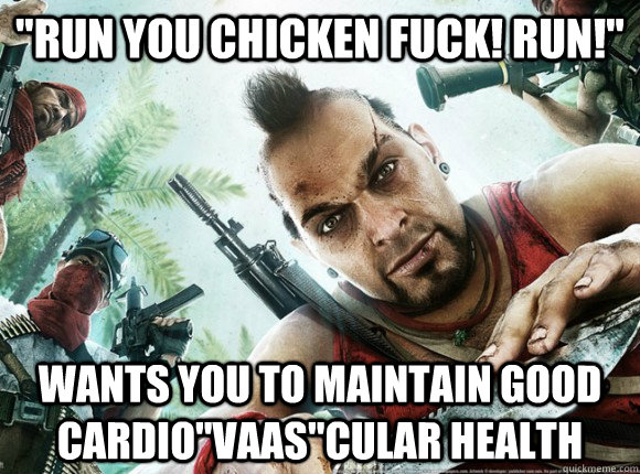 "Run you chicken fuck! RUn!" wants you to maintain good cardio"vaas"cular health