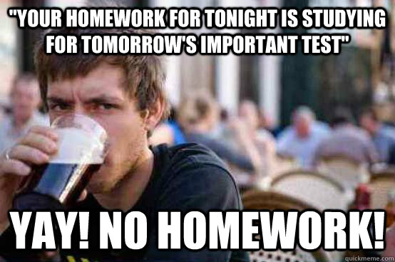 "Your homework for tonight is studying for tomorrow's important test" Yay! No homework!
