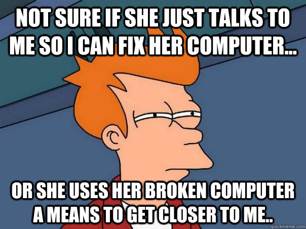 Not sure if she just talks to me so I can fix her computer... Or she uses her broken computer a means to get closer to me.. - Not sure if she just talks to me so I can fix her computer... Or she uses her broken computer a means to get closer to me..  Futurama Fry