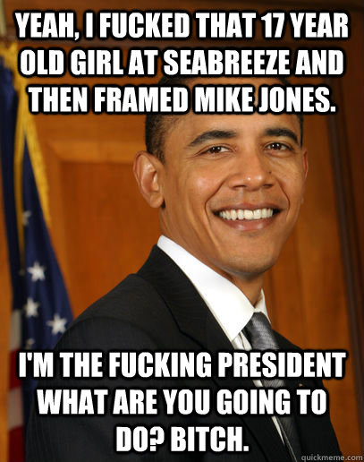 Yeah, I fucked that 17 year old girl at Seabreeze and then framed Mike Jones. I'm the fucking president what are you going to do? Bitch.