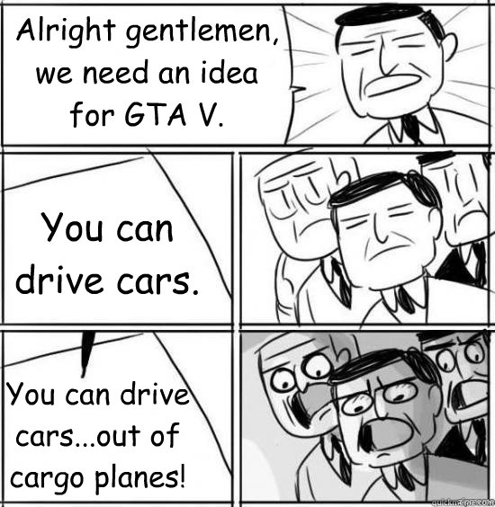 Alright gentlemen, we need an idea for GTA V. You can drive cars...out of cargo planes! You can drive cars.