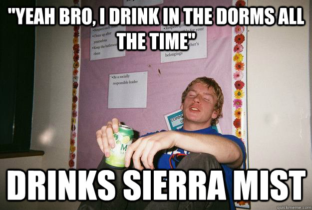 "Yeah bro, I drink in the dorms all the time" Drinks Sierra Mist