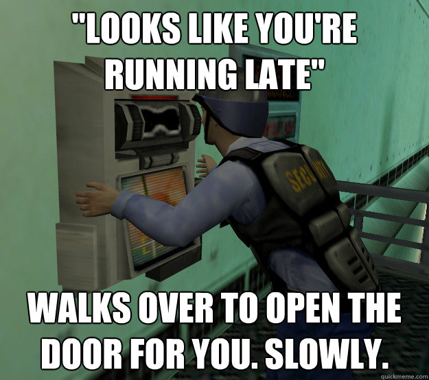 "looks like you're running late" walks over to open the door for you. slowly.