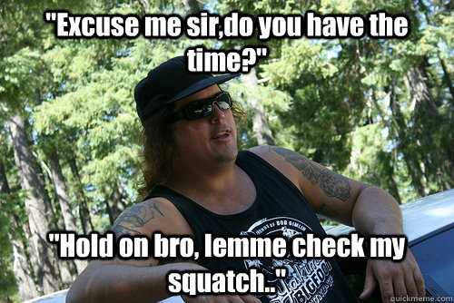 "Excuse me sir,do you have the time?" "Hold on bro, lemme check my squatch.."
