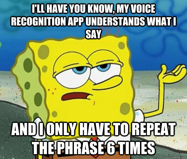 I'll have you know, my voice recognition app understands what I say And I only have to repeat the phrase 6 times - I'll have you know, my voice recognition app understands what I say And I only have to repeat the phrase 6 times  Tough Spongebob