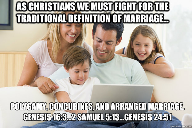 As Christians we must fight for the traditional definition of marriage... Polygamy, concubines, and arranged marriage. Genesis 16:3...2 Samuel 5:13...Genesis 24:51