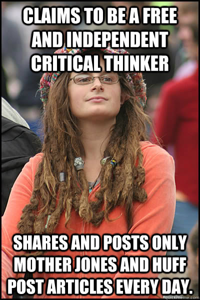 Claims to be a free and independent critical thinker Shares and posts only mother Jones and Huff Post articles every day. - Claims to be a free and independent critical thinker Shares and posts only mother Jones and Huff Post articles every day.  College Liberal