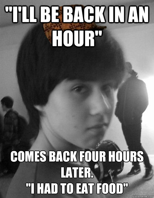 "I'll be back in an hour" Comes back four hours later. "I had to eat food"