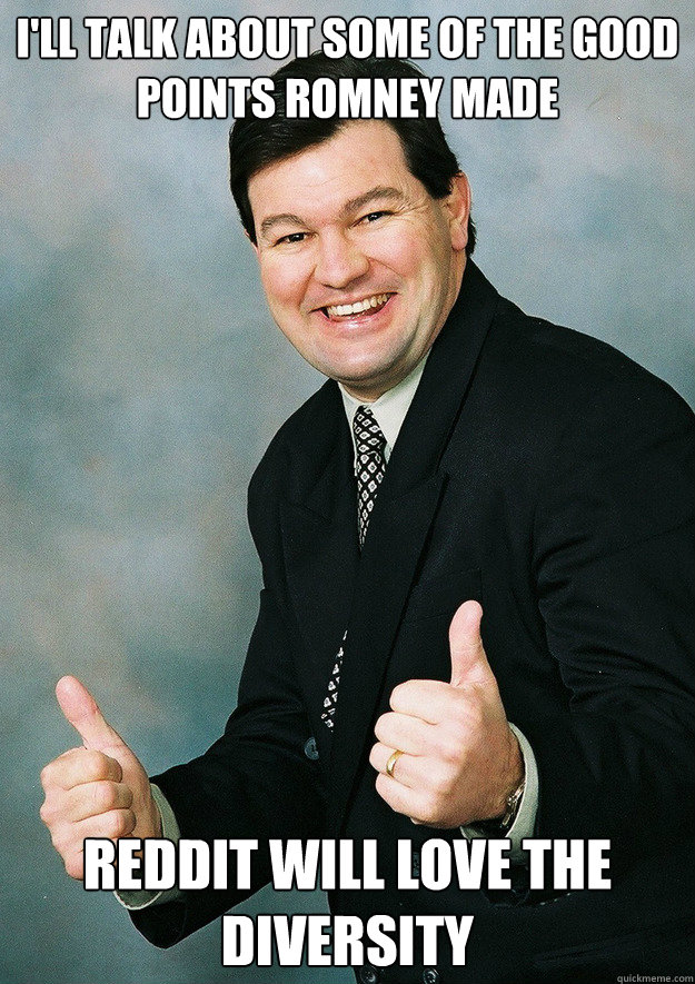 I'll talk about some of the good points Romney made Reddit will Love the diversity