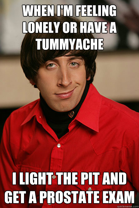 When I'm feeling lonely or have a tummyache I light the pit and get a prostate exam - When I'm feeling lonely or have a tummyache I light the pit and get a prostate exam  Pickup Line Scientist