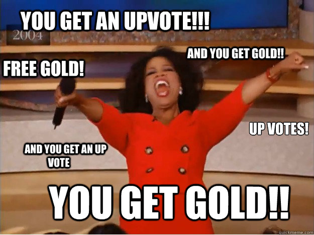 You get an upvote!!! You get gold!! AND you get gold!! AND you get an up vote free gold! up votes!