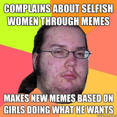 complains about selfish women through memes makes new memes based on girls doing what he wants