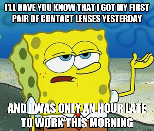 I'll have you know that I got my first pair of contact lenses yesterday And I was only an hour late to work this morning