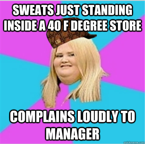 sweats just standing inside a 40 F degree store complains loudly to manager
