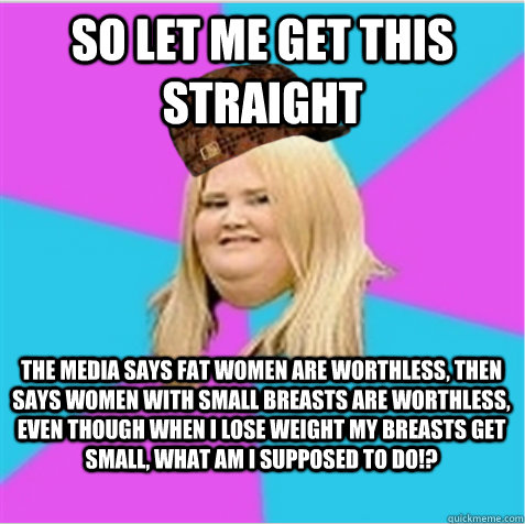 so let me get this straight the media says fat women are worthless, then says women with small breasts are worthless, even though when I lose weight my breasts get small, what am I supposed to do!?