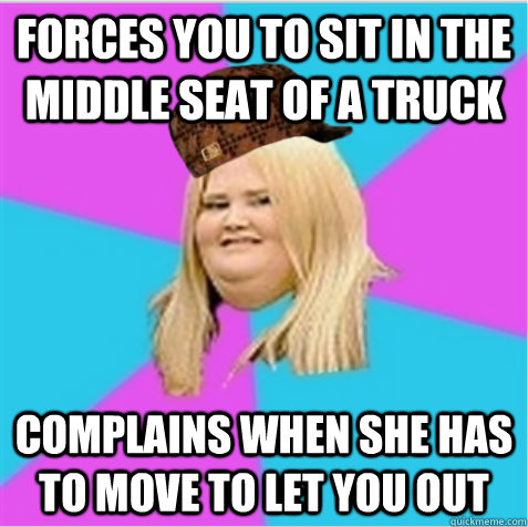 forces you to sit in the middle seat of a truck complains when she has to move to let you out