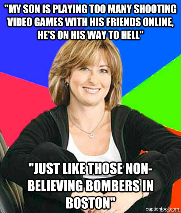 "My son is playing too many shooting video games with his friends online, he's on his way to hell" "Just like those non-believing bombers in Boston"
